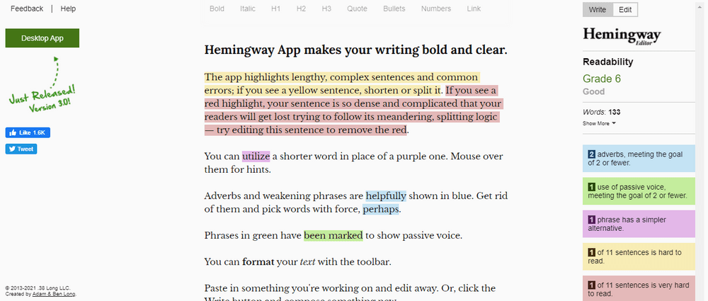 Hemingway is a writing assistance tool that you can use in your assignments/ research to polish your language skills.